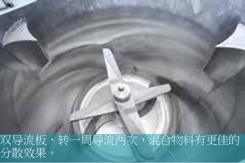 Double baffles, with two times of flow diversion per rotation, ensure better dispersion effect of mixed materials.
